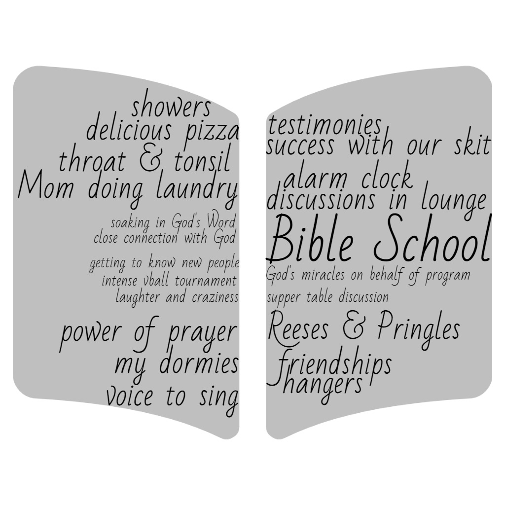 My prayer group blessed me tremendously as we shared, prayed and witnessed God’s power. I still thank God for them. I thanked God for my dormies. We learned cooperation and teamwork very quickly in our cramped quarters. I was thankful for them even though I’d wake up at two o’clock from someone’s phone jangling, a cough, or someone mumbling. I thanked God for my classmates with their insights and their willingness to share and discuss things. In class, in the lounge, or at the supper table, we explored God’s Word together. Perhaps our discussions strayed from the specific purpose of our homework, but we still learned from each other!